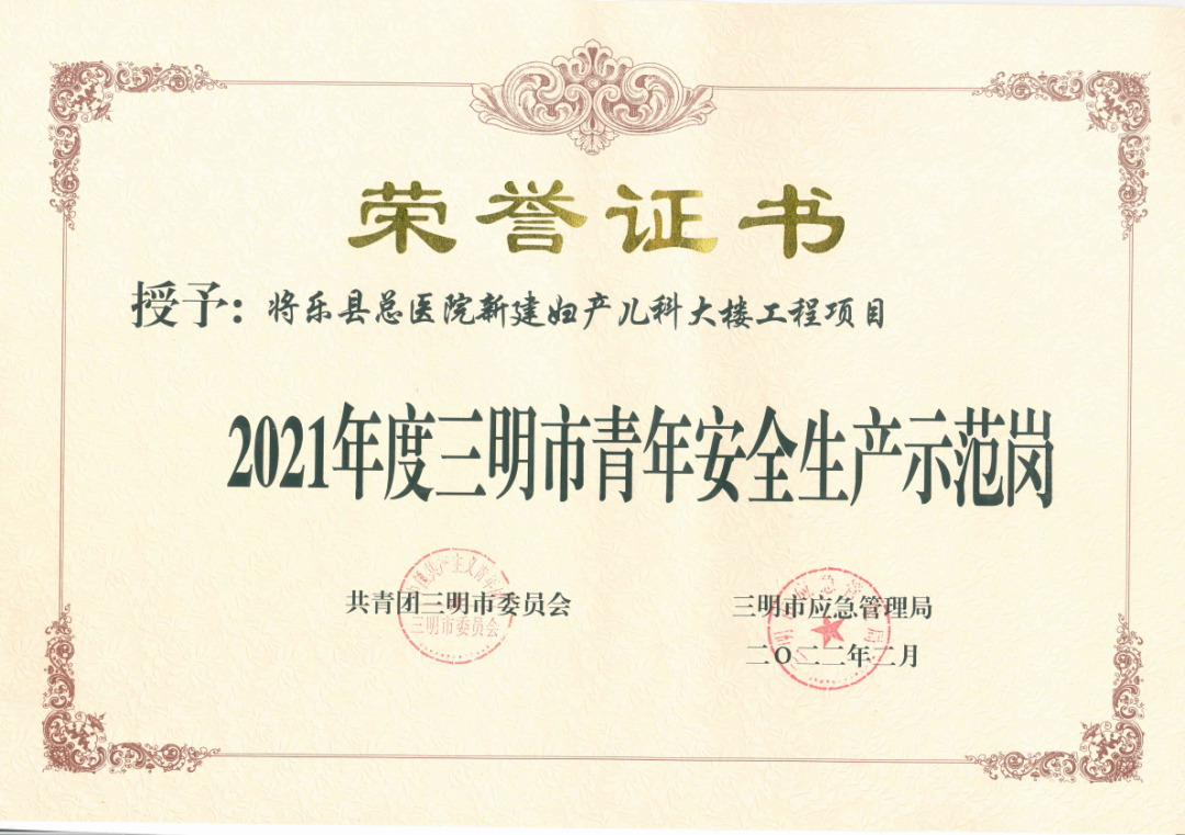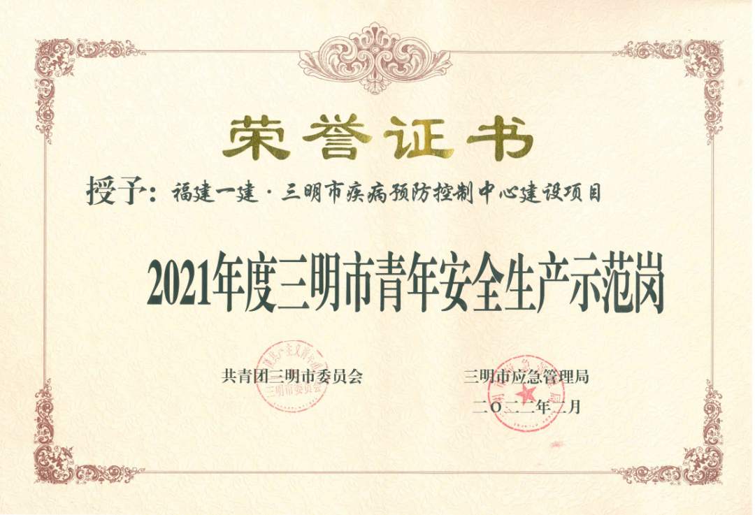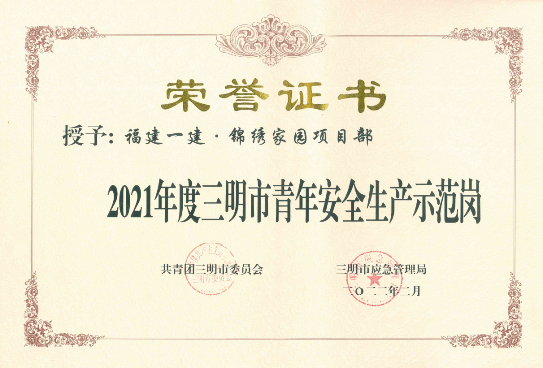 近日,共青团三明市委员会、三明市应急治理局发文认定2021年度三明市青年宁静生产示范岗,福建AG庄闲集团2021年度创立青年宁静生产示范岗的6个项目均列榜中,划分是三明生态康养城建设项目(C-16地块)、锦绣家园项目、日月青春项目、三明学院实验小学实验幼儿园及周边隶属工程项目、三明市疾病预防控制中心项目、将乐县总医院新建妇产儿科大楼工程项目。