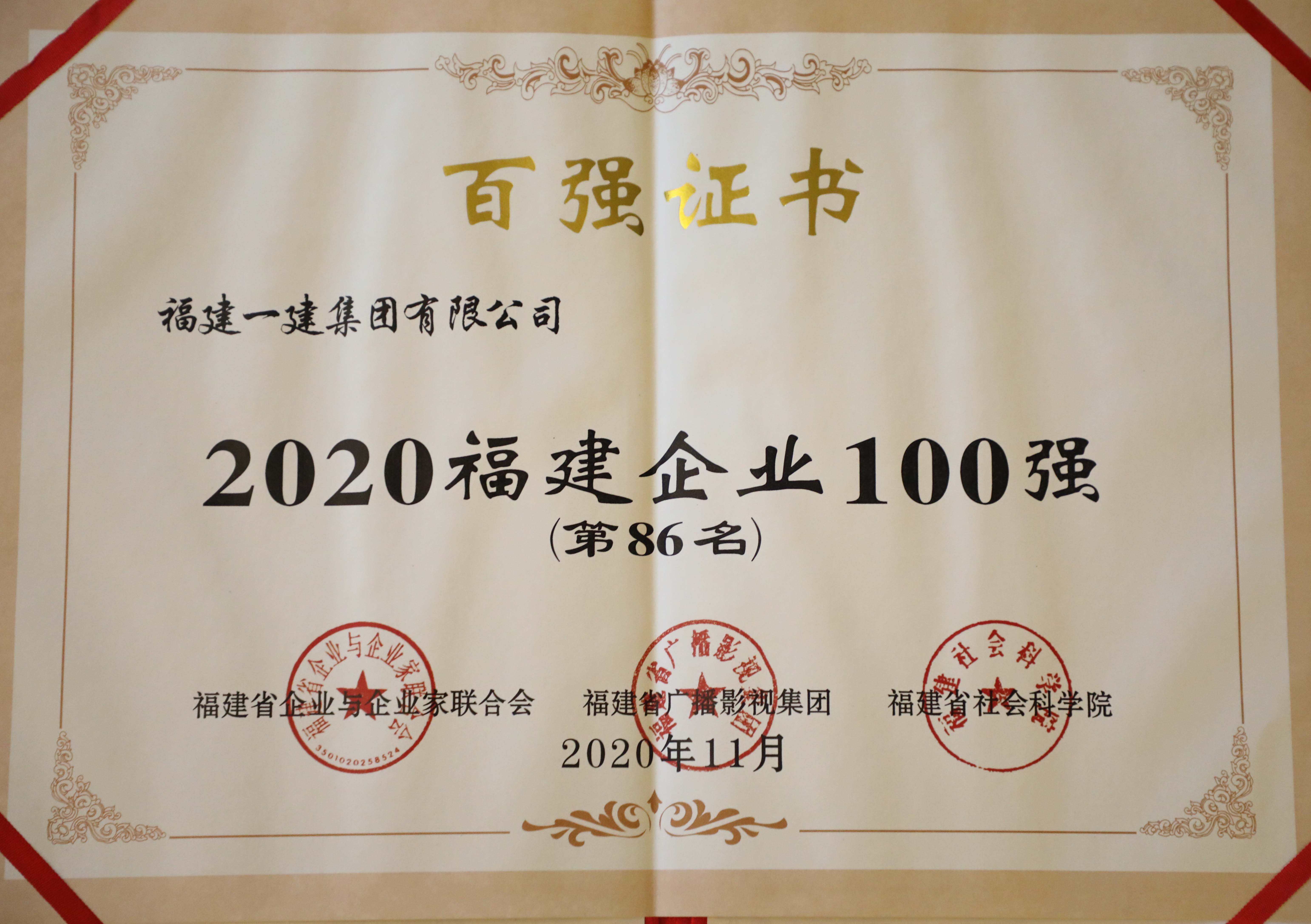 依照中国企业联合会研究宣布“中国企业500强”的做法评选而出的“福建企业100强”榜单,是一份严谨、科学、专业的榜单,被誉为“福建企业界的福布斯排行榜”,评选结果是福建省企业革新立异生长乐成经验的充分展示,也是闽商“敢为天下先,爱拼才会赢”争先创优精神的证言。2020年福建百强企业入围单位营业收入门槛已提升至70亿元,并新增“2020福建战略性新兴工业领军企业100强”。入选 “2020福建企业100强”的建筑业企业共有15家,其中国有建筑企业仅4家。福建AG庄闲集团是全省唯一入选“2020福建企业100强”和“2020福建效劳业企业100强”的市属国有建筑企业。